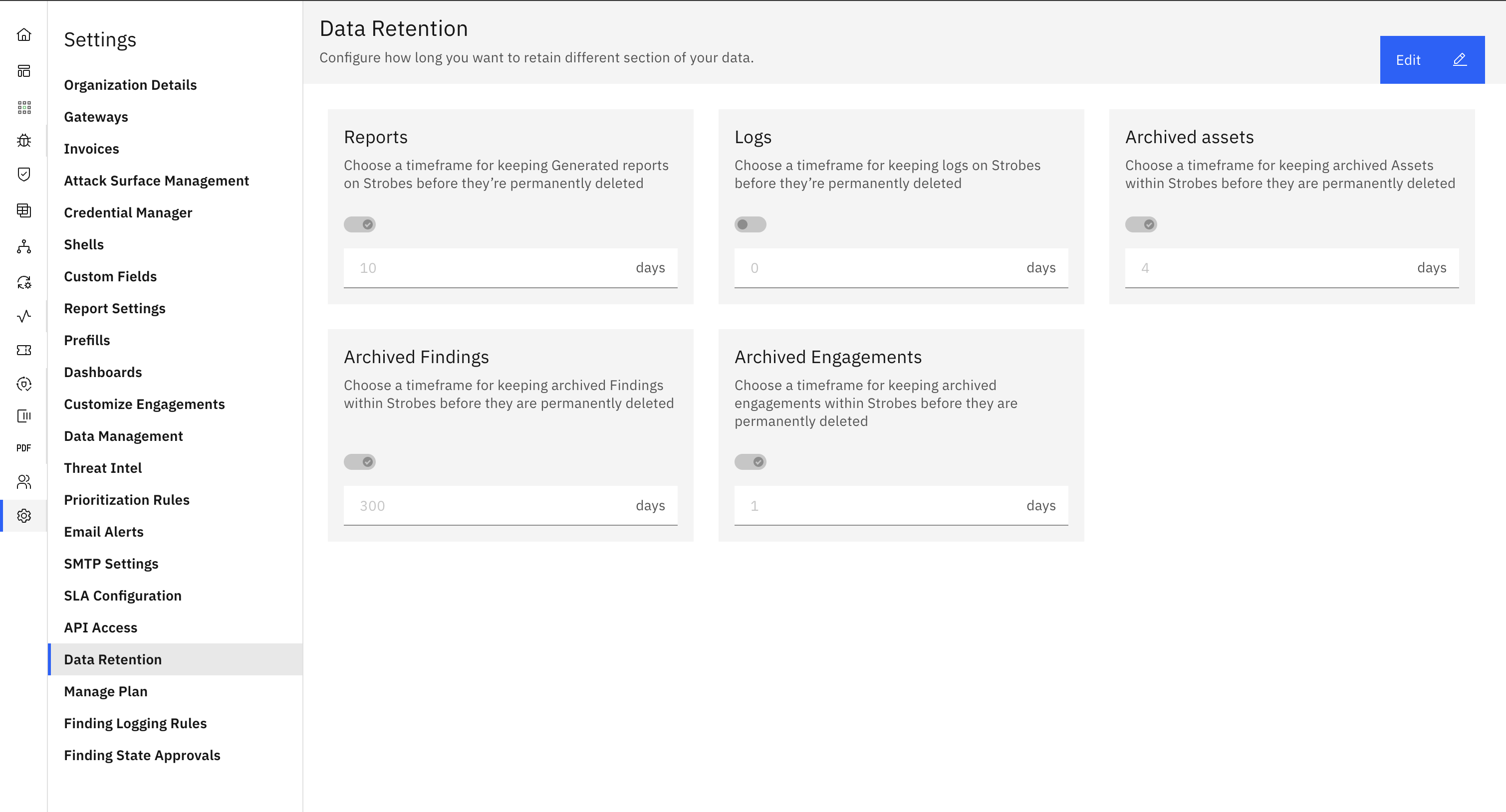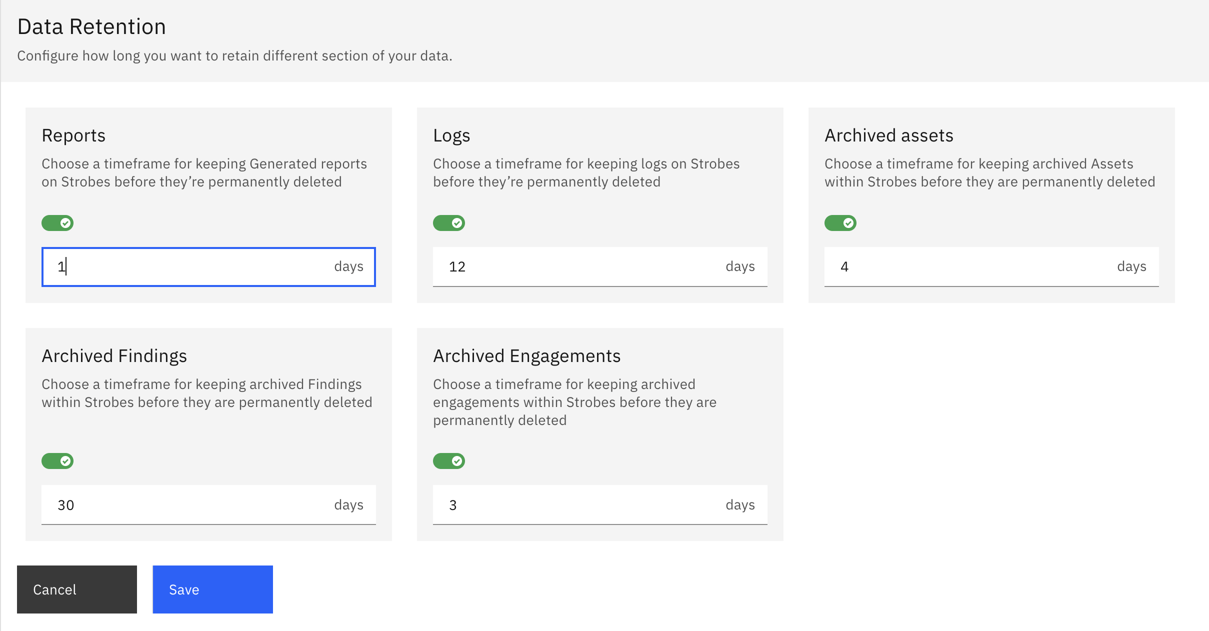 - Reports: The duration for which you want the generated vulnerability reports to be retained on the platform before they get permanently deleted.