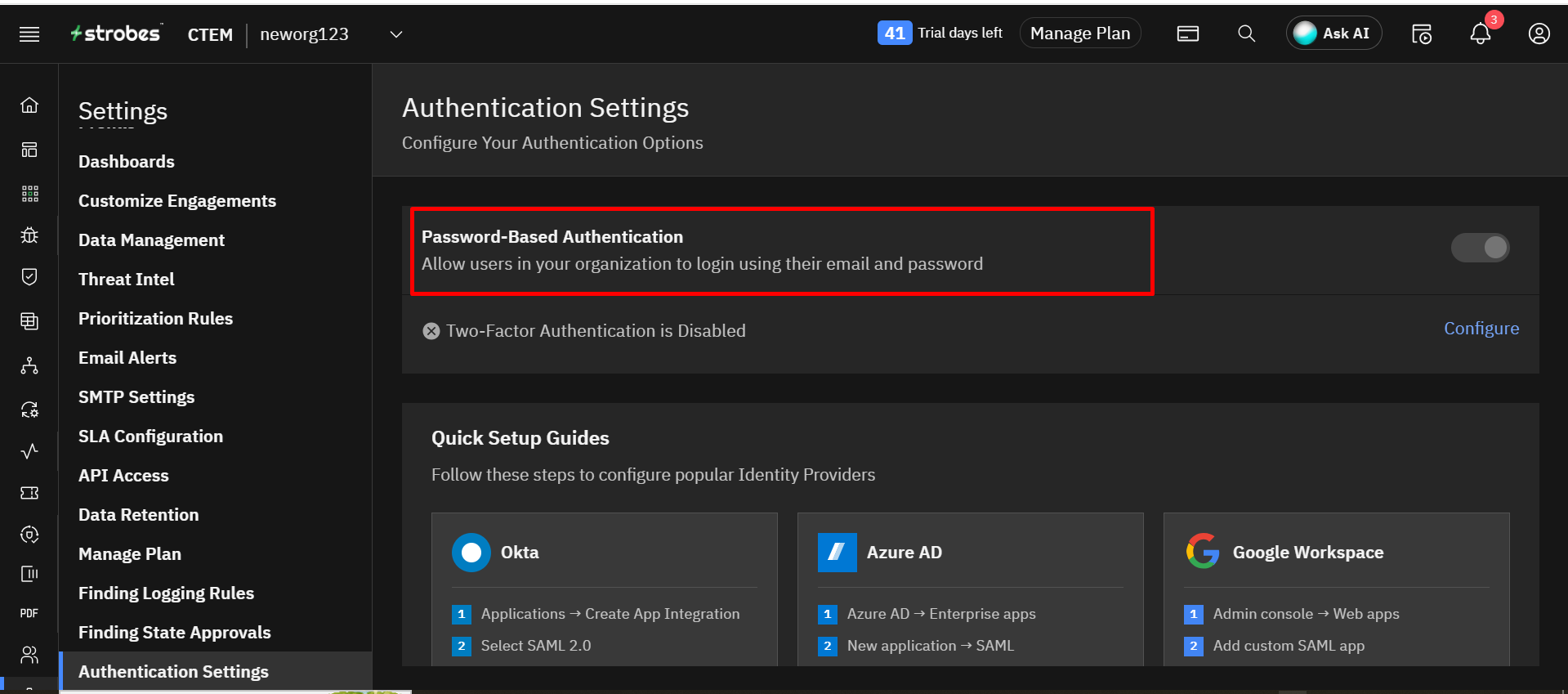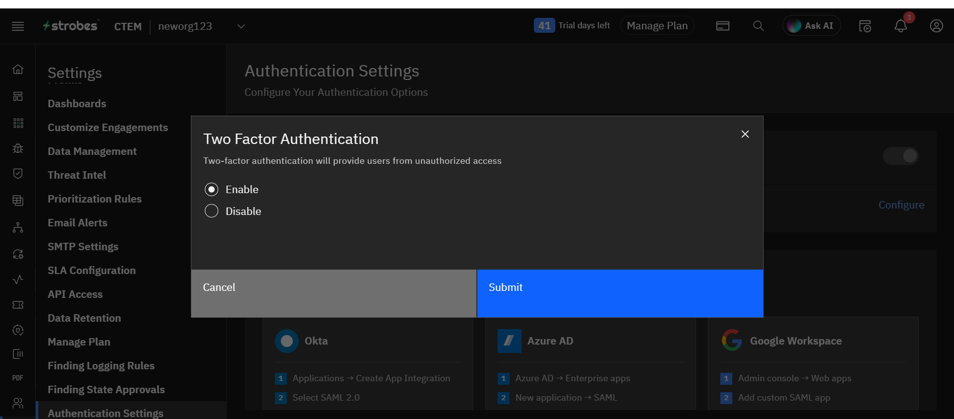 Two-Factor Authentication (2FA) adds an extra layer of security to your Strobes account. Only the Owner of an organization can enable this feature.