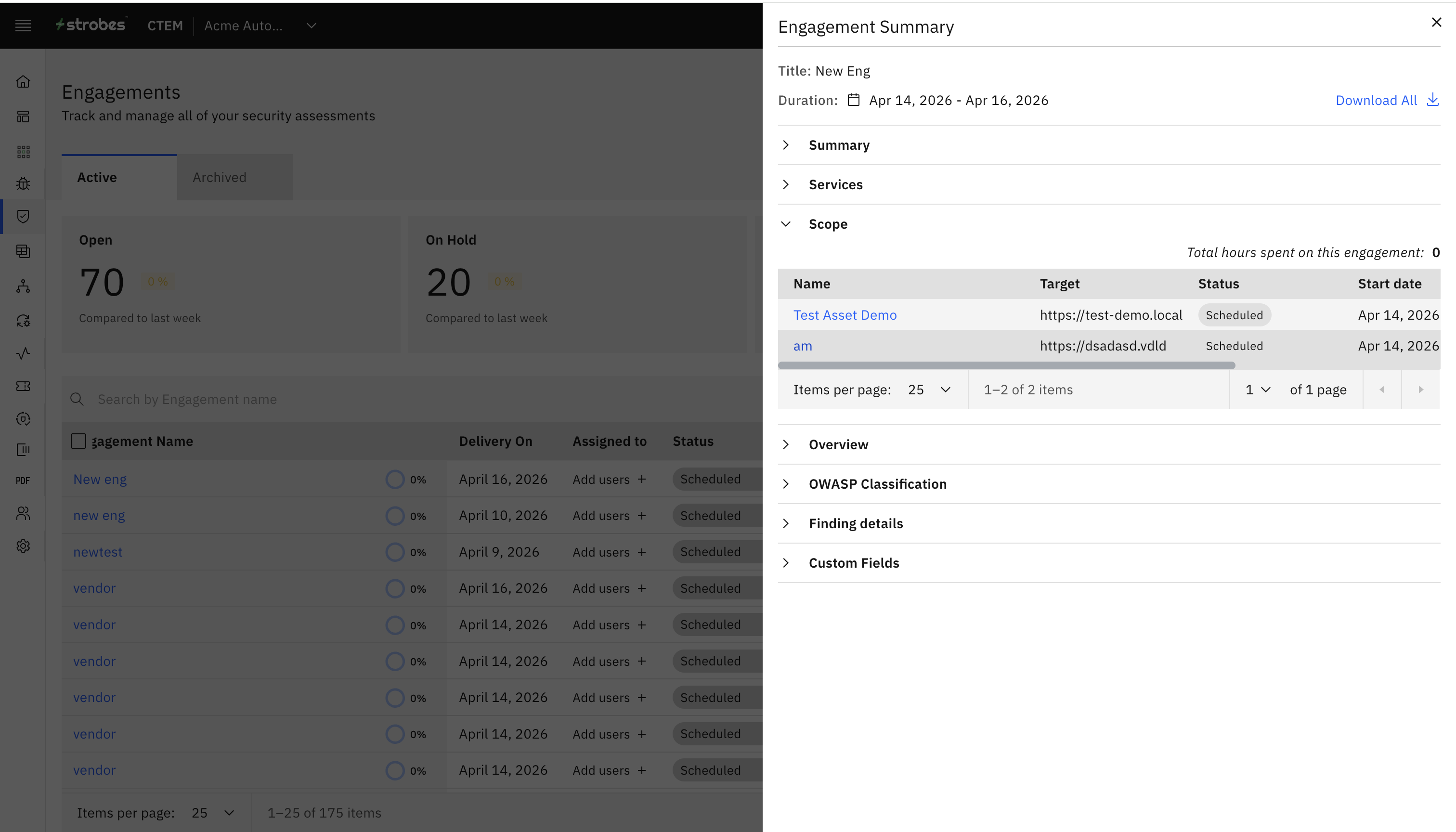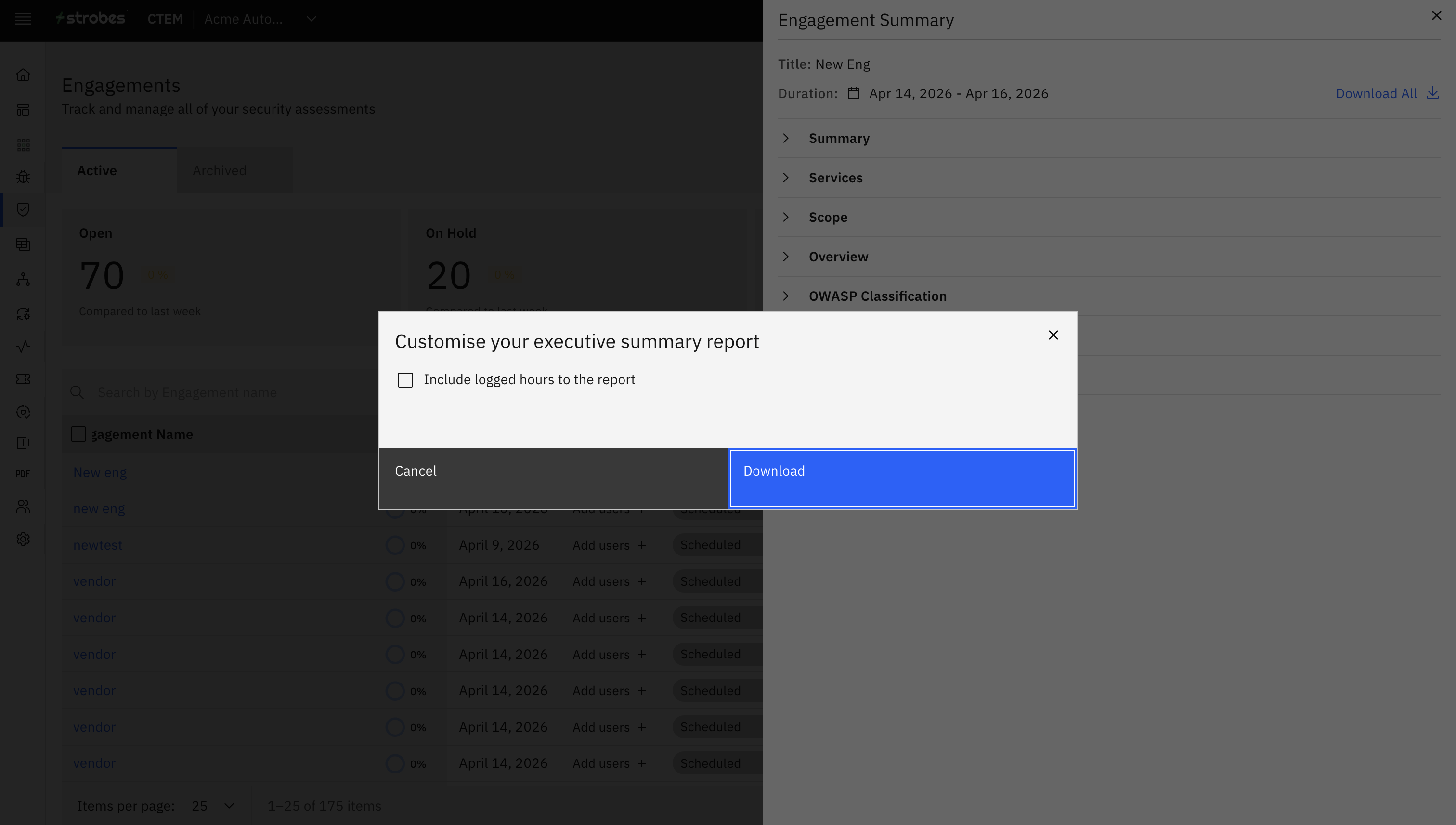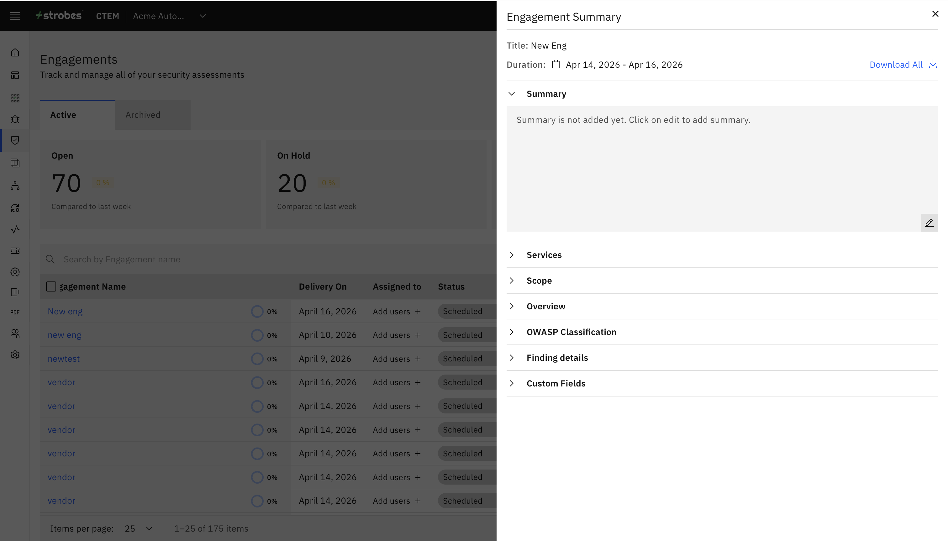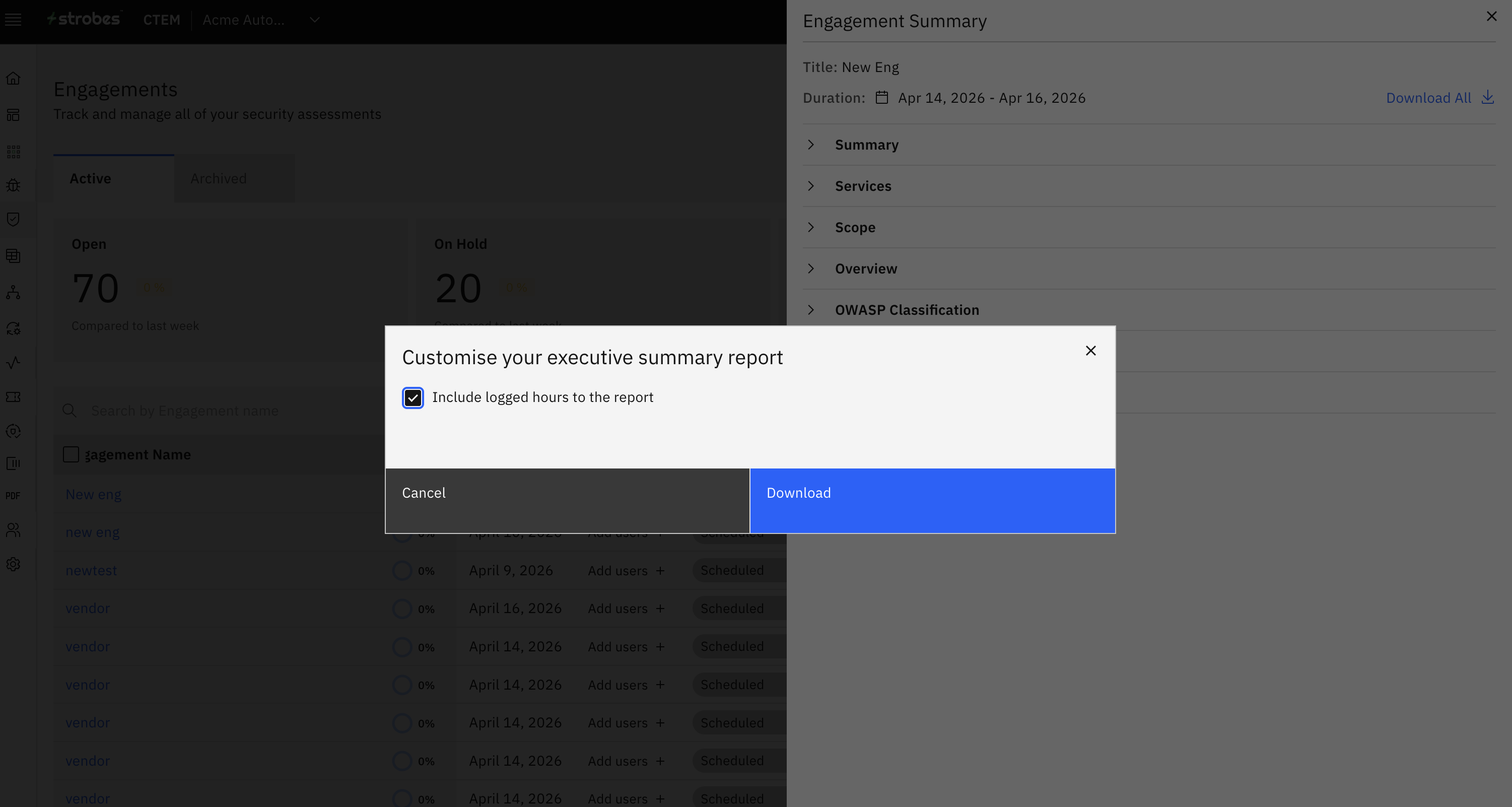 The Engagement Summary gives you a complete snapshot of an engagement, including scope, vulnerabilities, team efforts, and more. This section helps you keep track of the assessment's progress and export detailed reports easily.