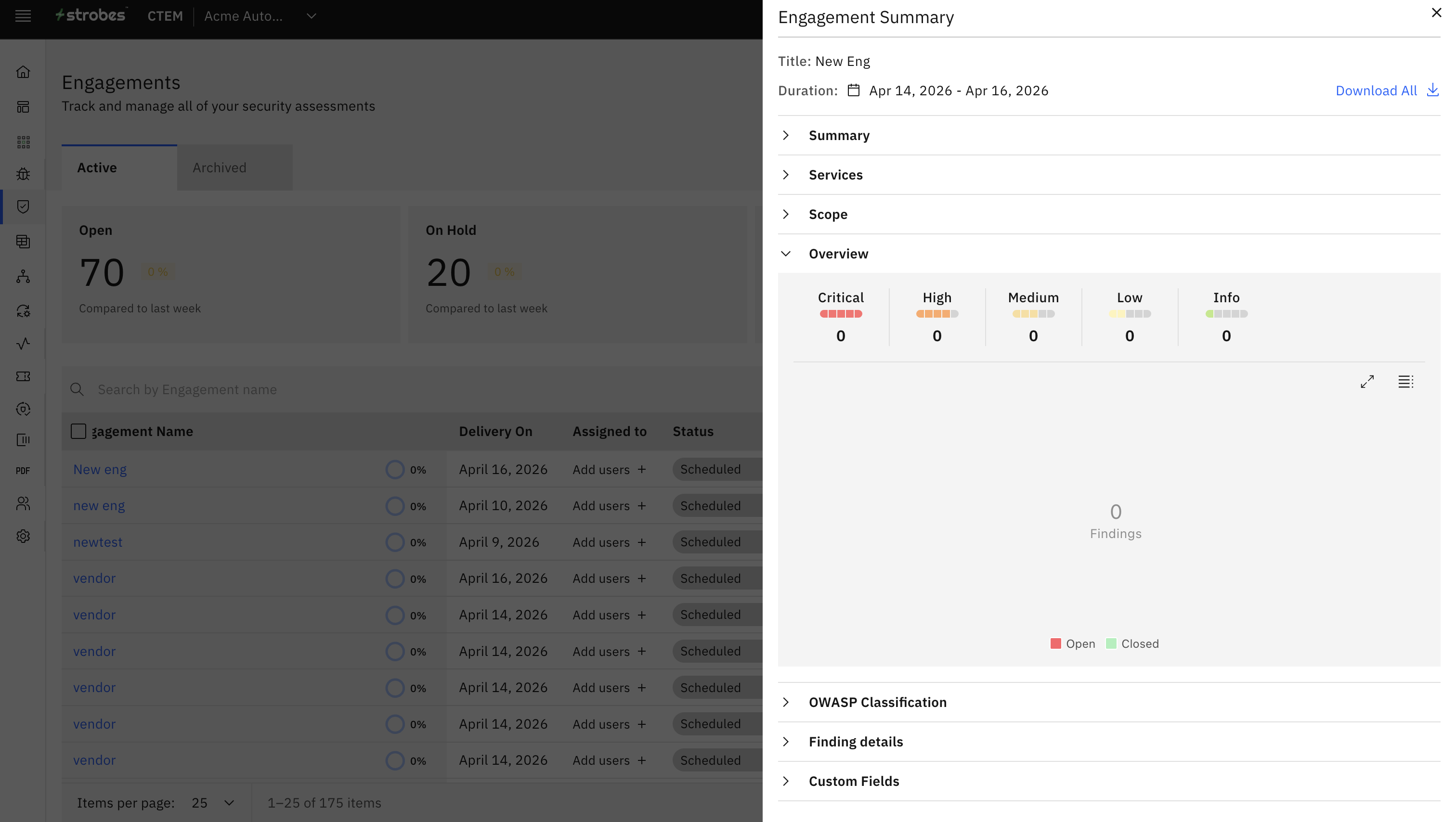 - Closed - OWASP classification - This section displays the breakdown of vulnerabilities reported in an engagement which belong to different categories of OWASP and also the breakdown of how many vulnerabilities are open and closed.
