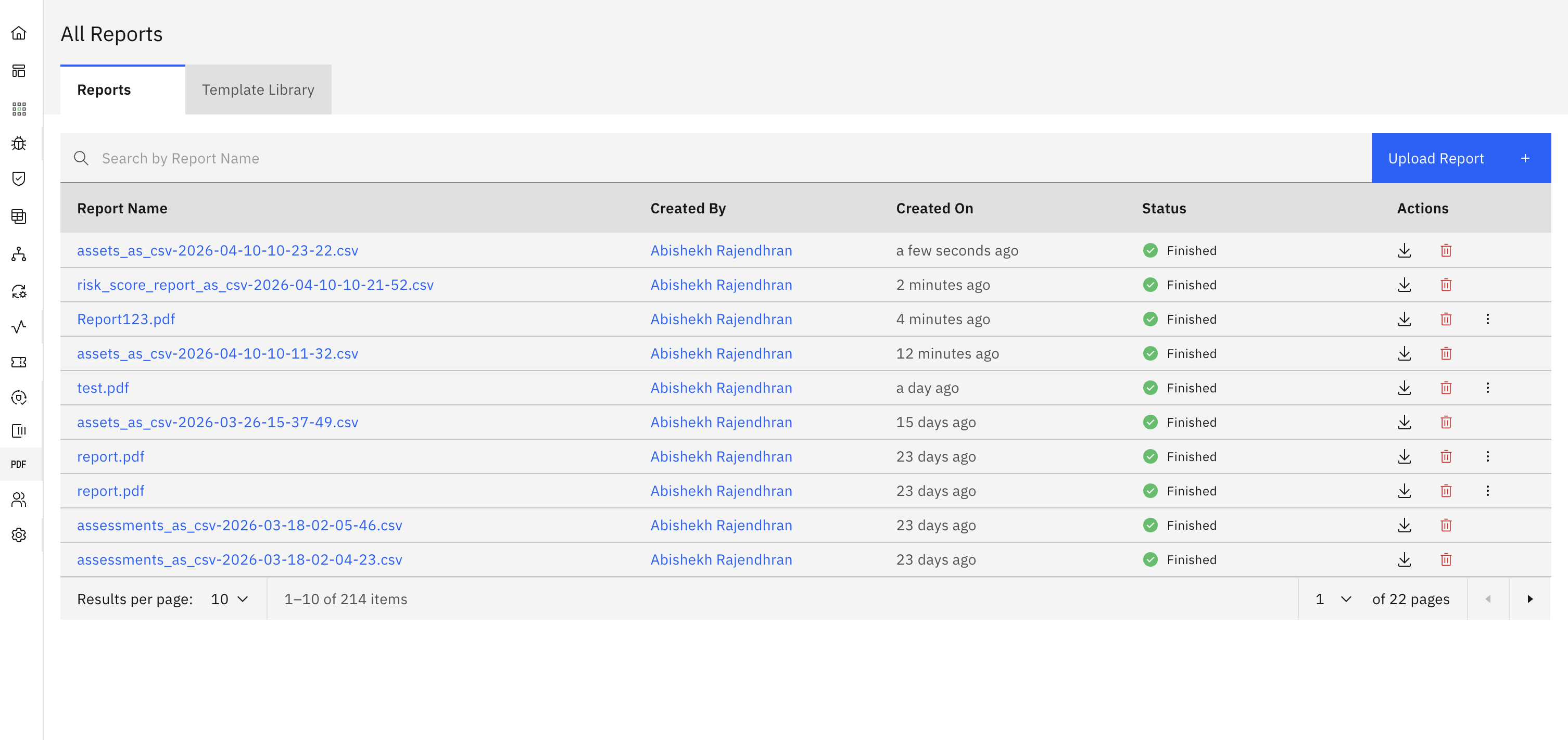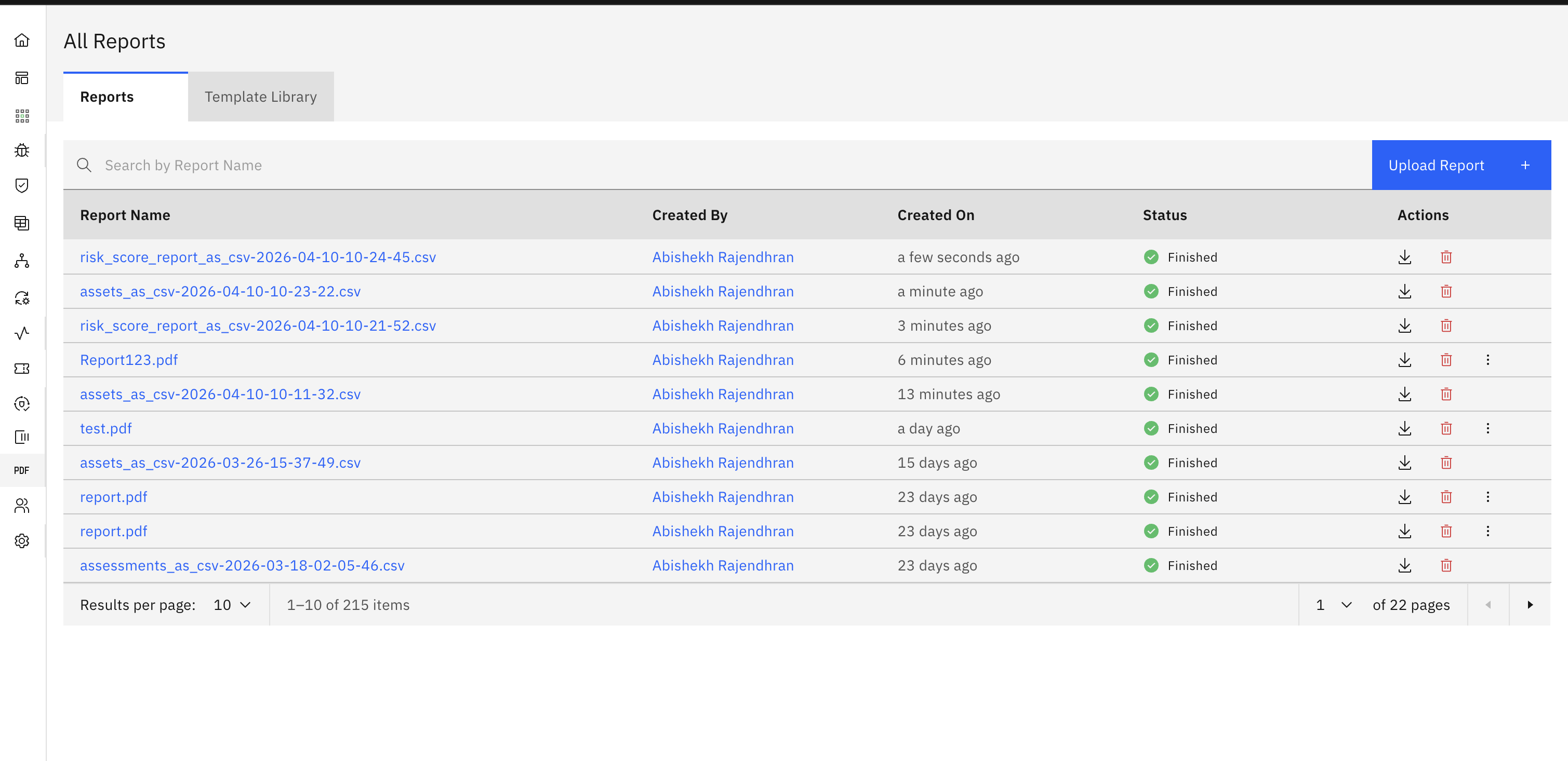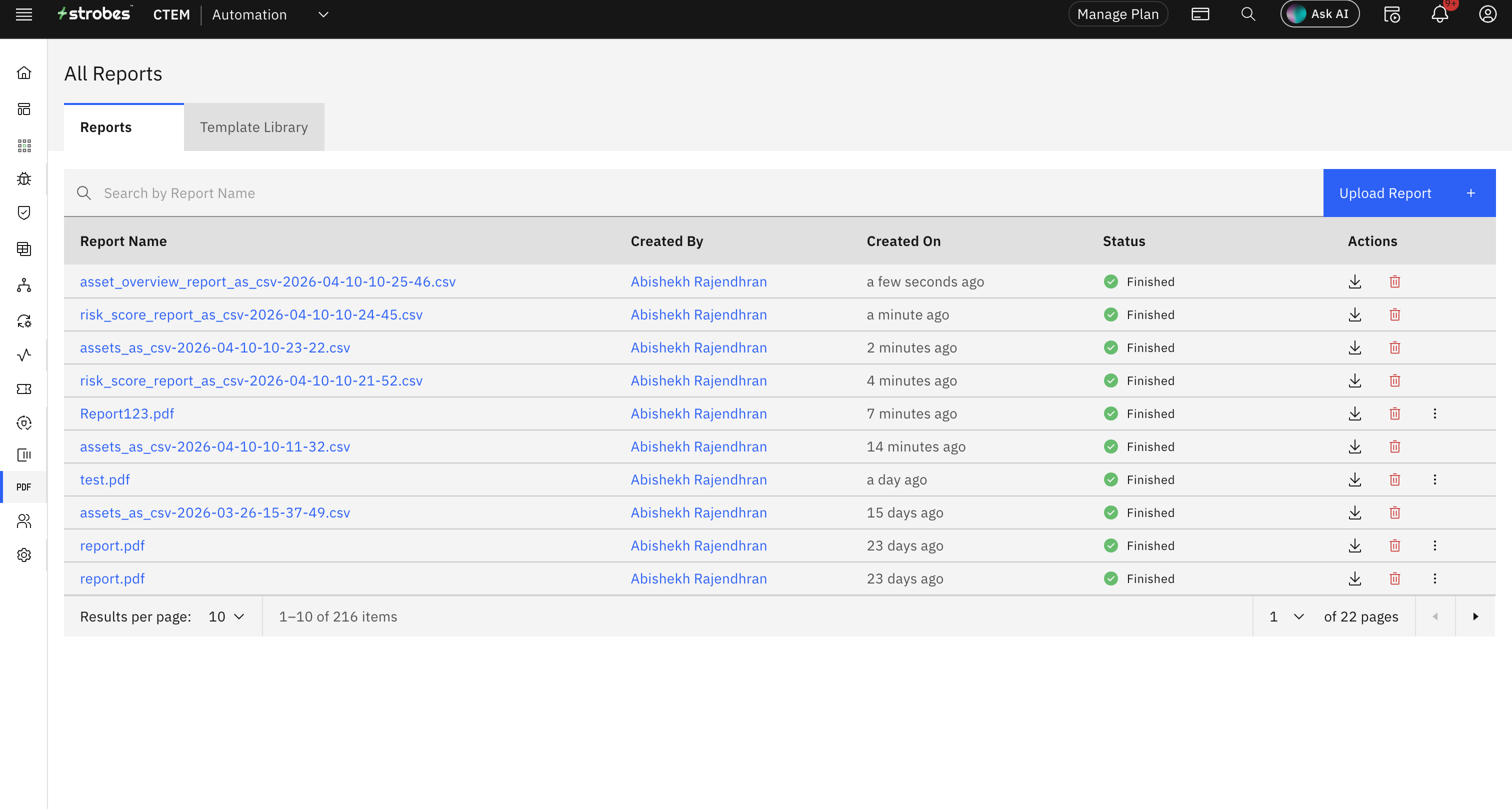 Strobes allows you to export assets reports in various formats. To export a report, navigate to the Asset Management page and click on the Actions button in the toolbar. Once you have exported the report, it will be available for download under the 'Reports' section.
