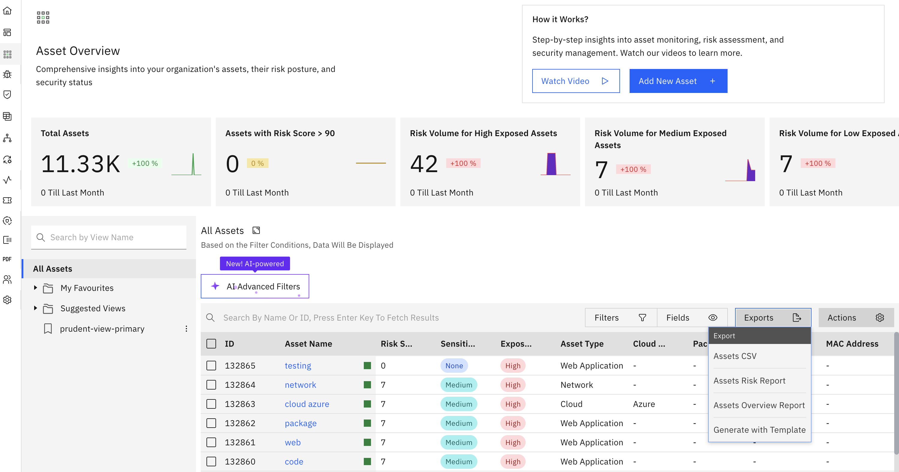 Using the 'Export Assets Overview Report' option, you can download the overview report for your assets in a CSV format. The overview report will only contain the assets against which vulnerabilities have been logged. If you need the report for a select few assets (e.x Network assets only), you can apply filters and then download the report for only the assets that you require. More about how to apply filters here. The downloaded file will have the following information: