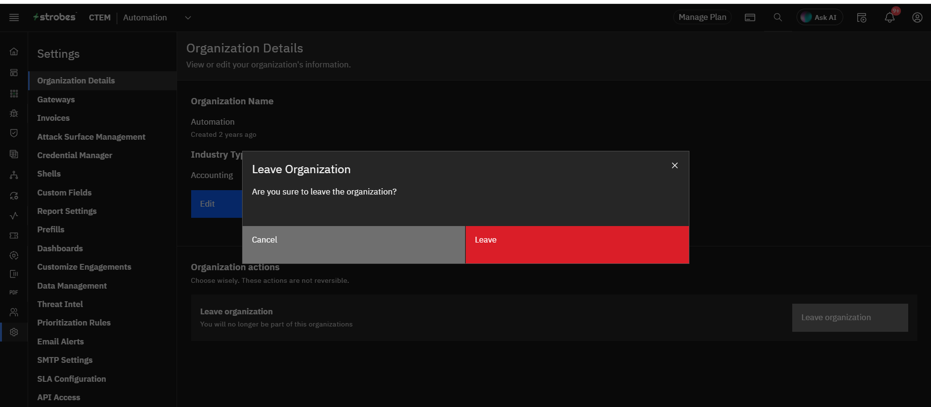 - Click Leave Organization.