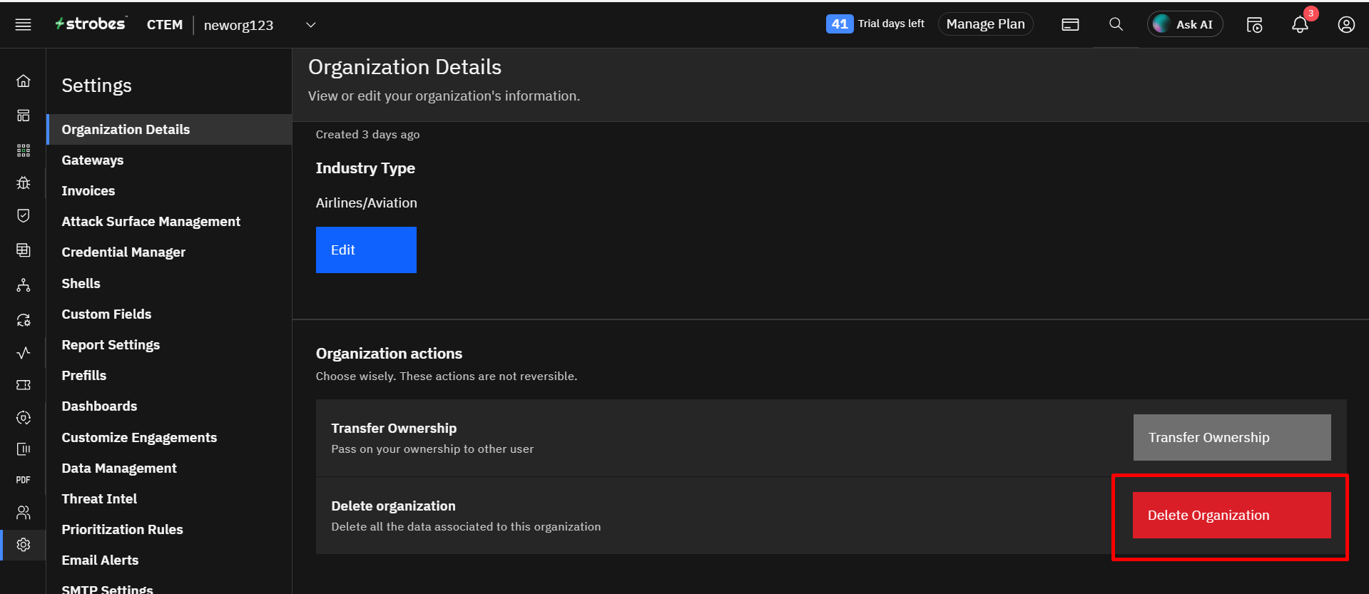 Important: This action is irreversible. Deleting the organization will permanently erase all associated data.