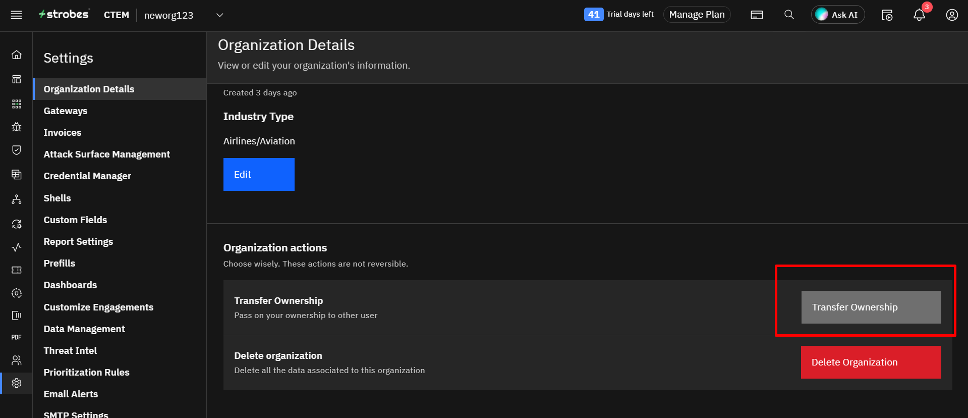 - Go to Organization Details and locate the Organization Actions section.