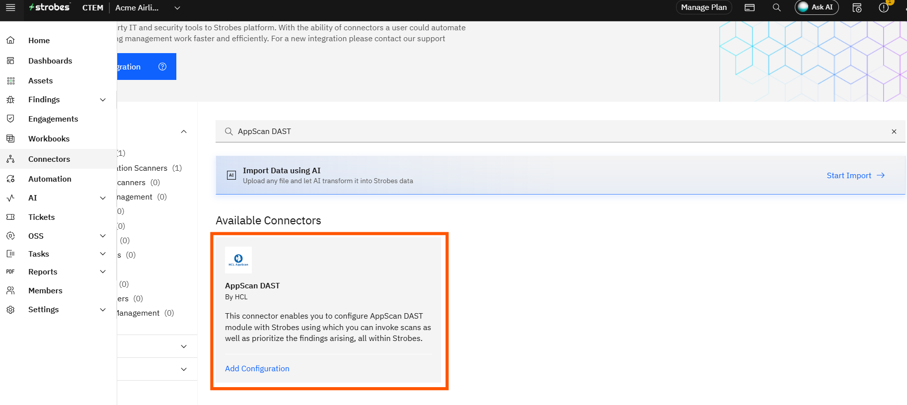 - Once you have configured your credentials, navigate to 'Dynamic Application Scanners' under 'Connectors' and click on 'AppScan DAST'.