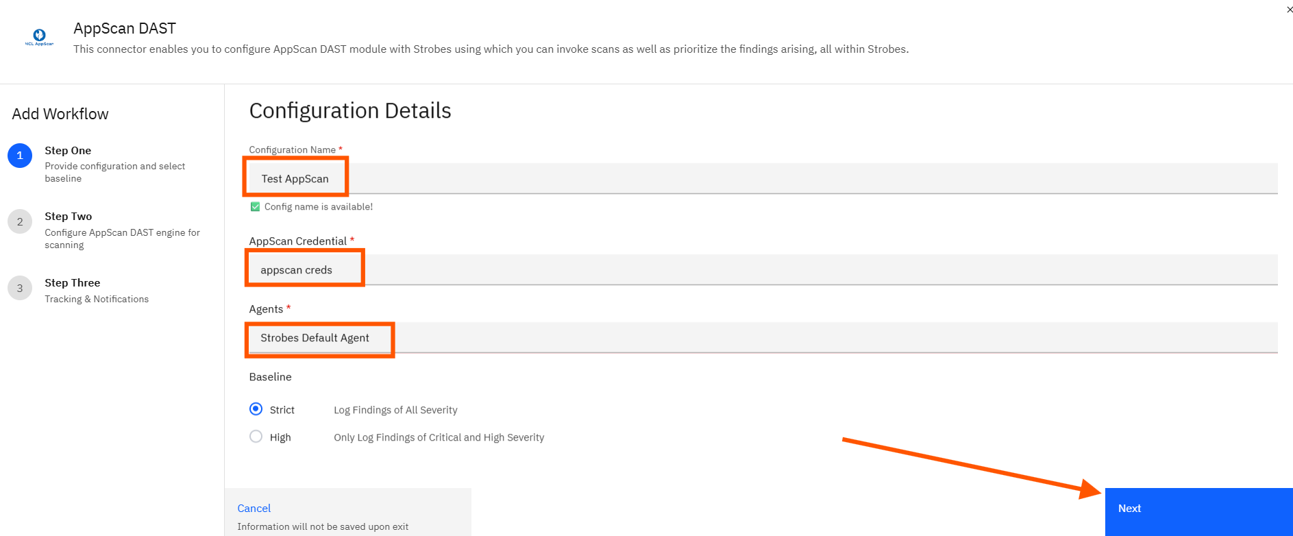 - Enter a 'Configuration Name', select your 'AppScan Credential' and the Agents as Strobes Default Agent.