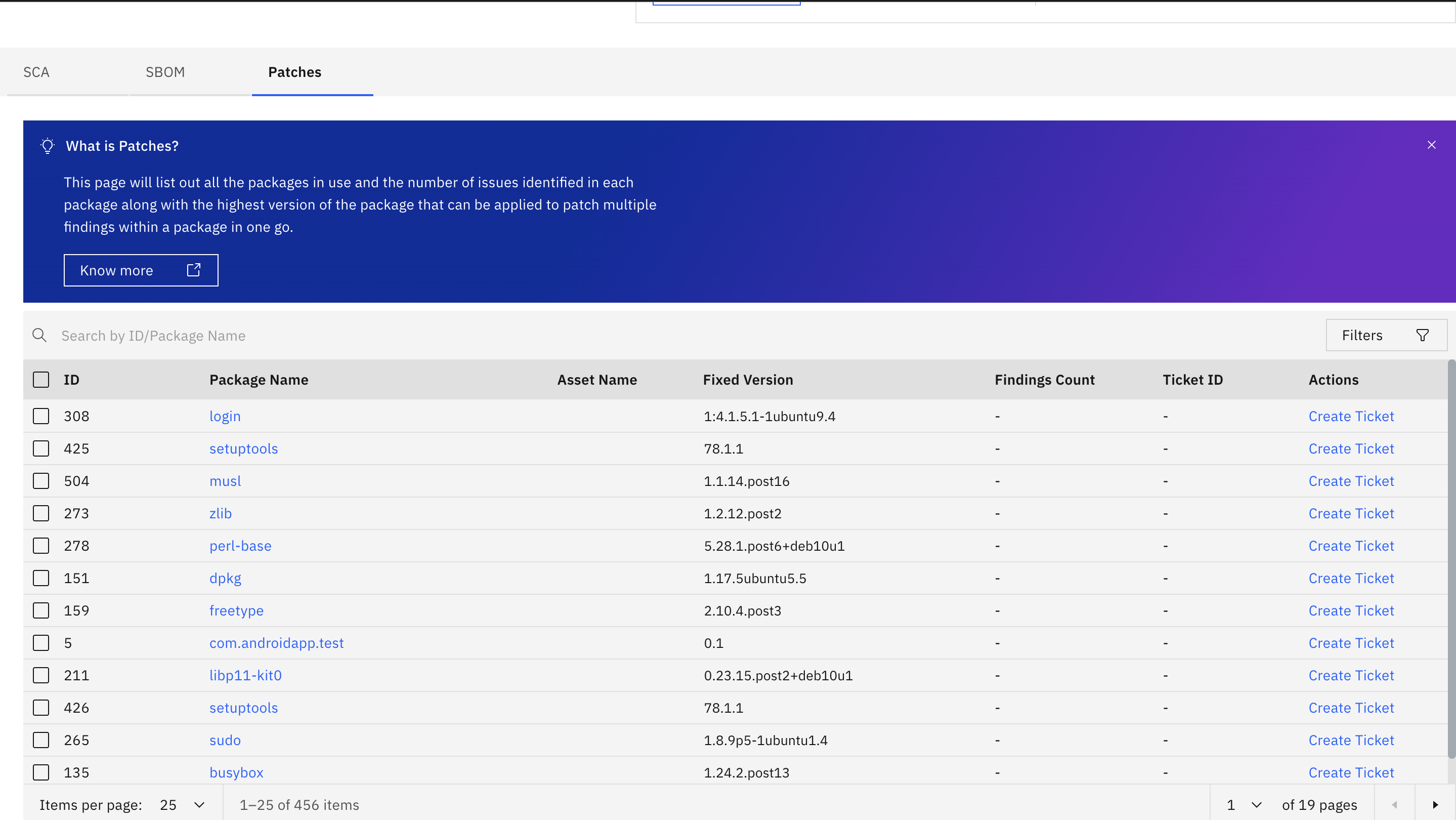- Ticket ID: If a remediation ticket (e.g. a Jira ticket) has been created for this package, this column displays the ticket’s ID (such as the Jira issue key). This lets you track whether a fix is already in progress. If no ticket exists, it may be blank or “–”.