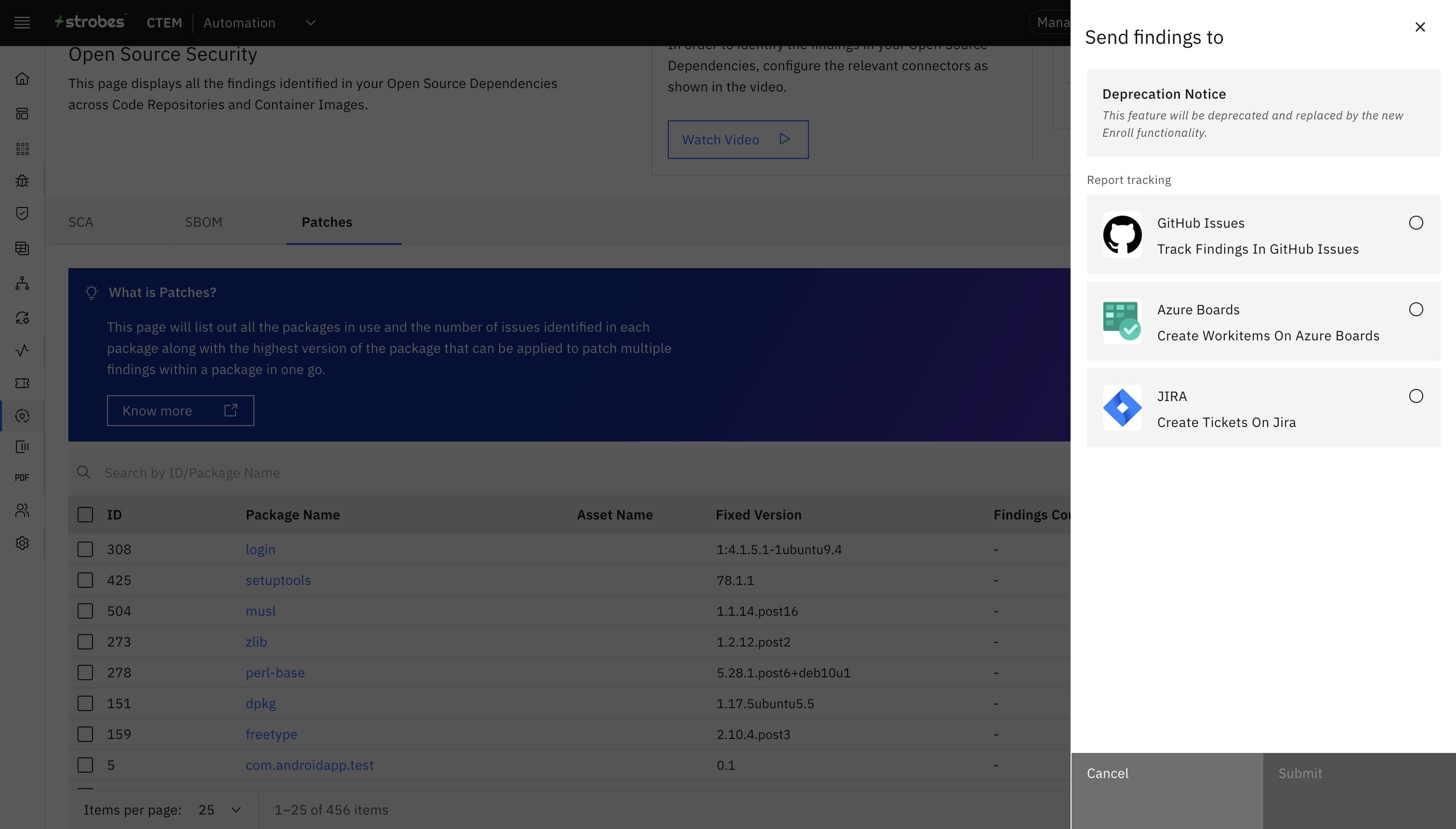 The OSS Patches page on Strobes provides a centralized view of all vulnerable open-source packages across your organization, along with the tools needed to take swift remediation actions.