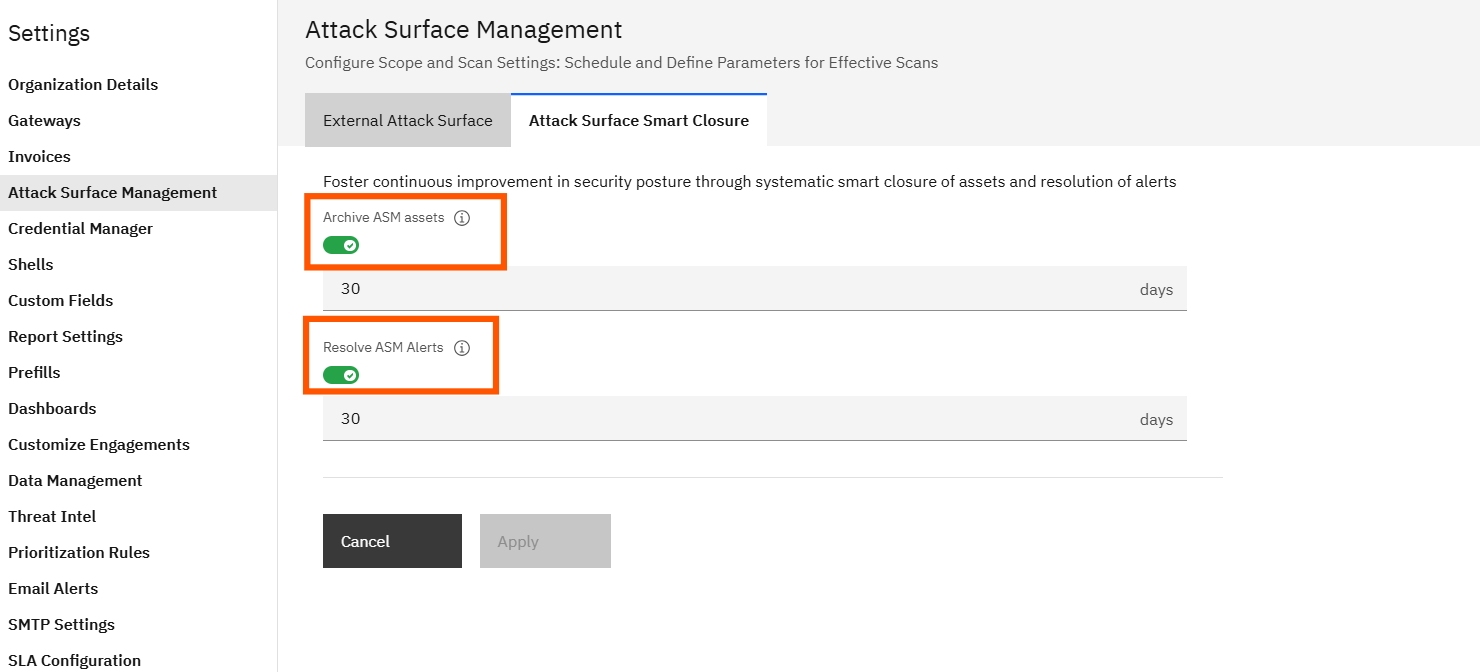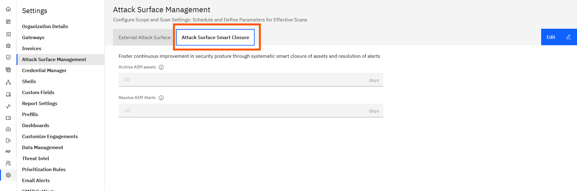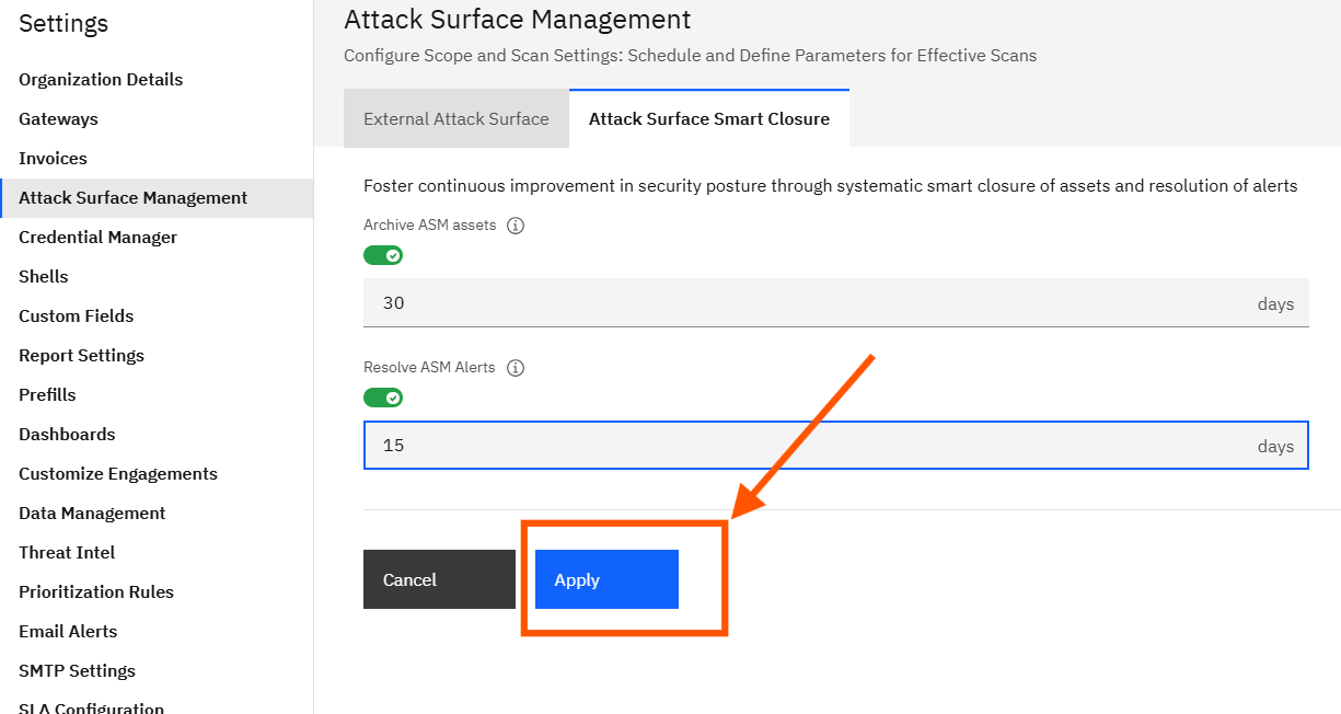 Navigate to Settings → Attack Surface Management → Attack Surface Smart Closure tab.