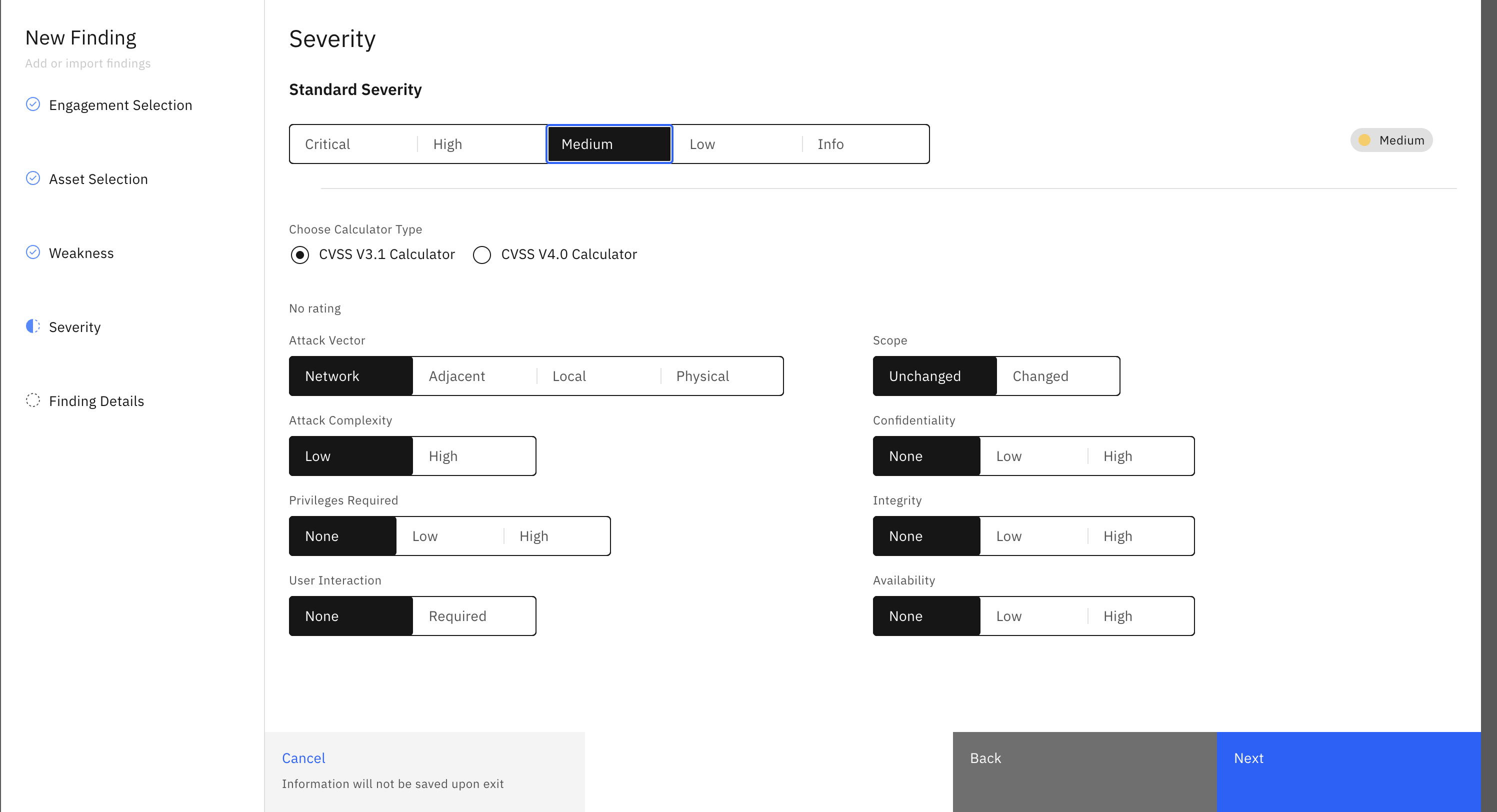 - Select a severity for the vulnerability that you are currently logging. You can either choose a standard severity or give your input to the CVSS calculator and it will calculate the severity for you. More about how the CVSS calculator works here.