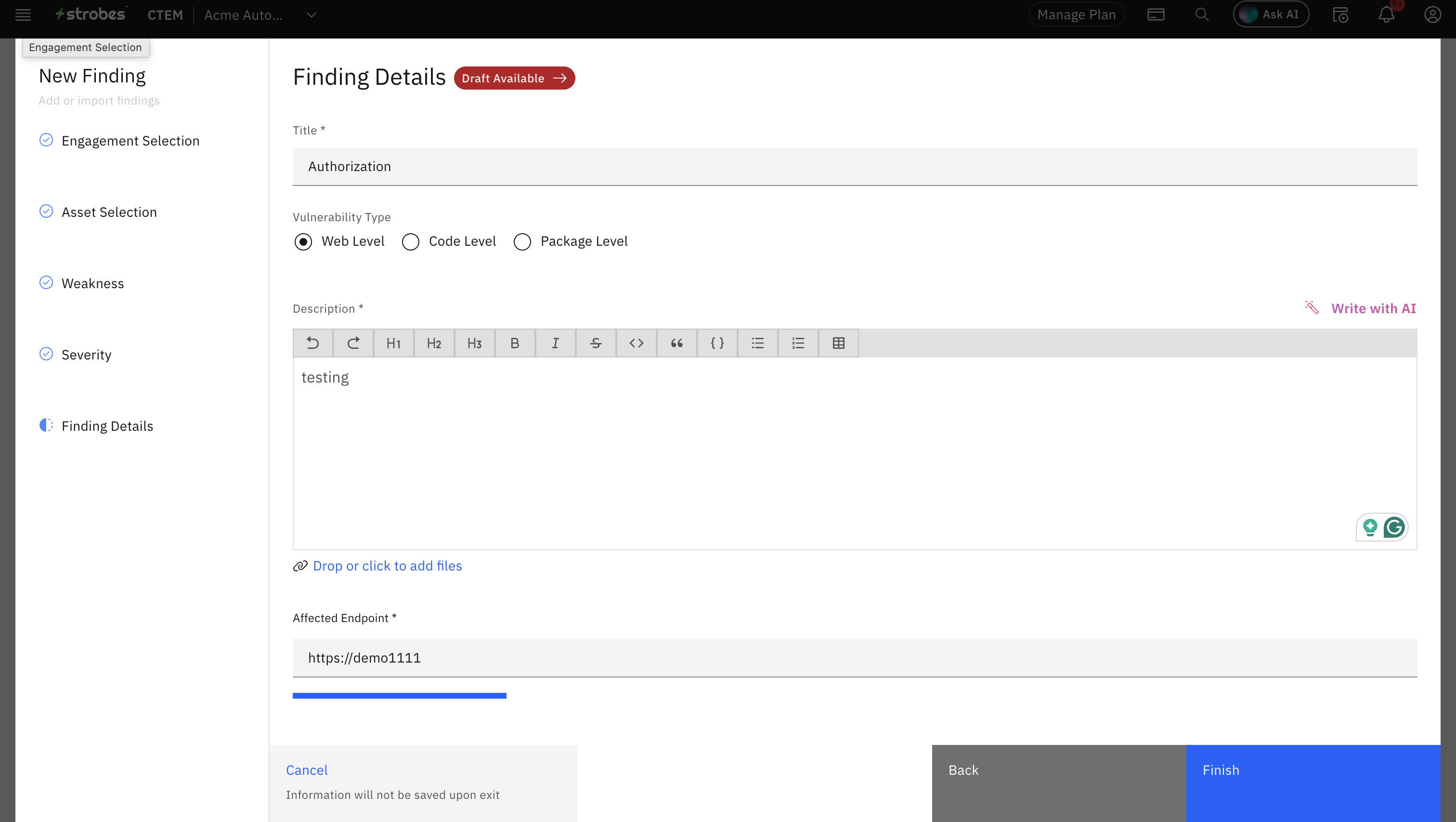 - Click on 'Finish'. The vulnerability has been logged successfully.