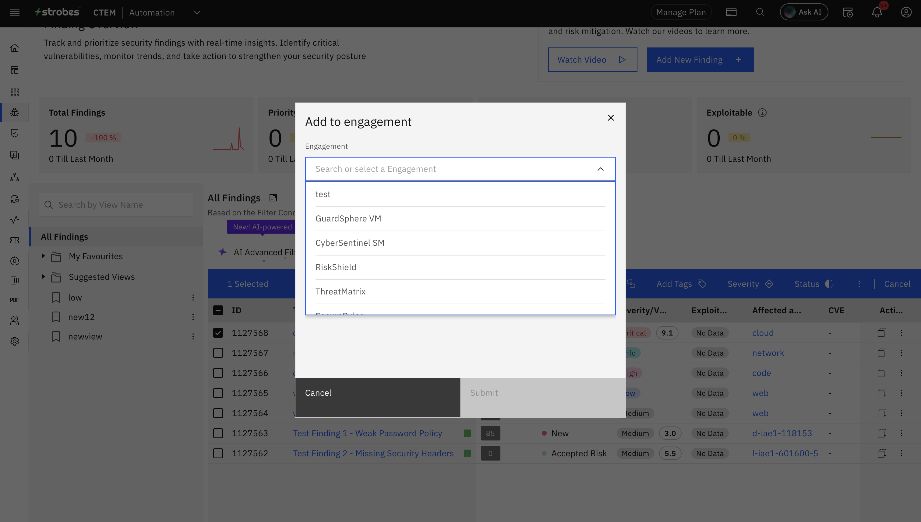 - Select the engagement for which you need to add the vulnerabilities and click on 'Submit'.