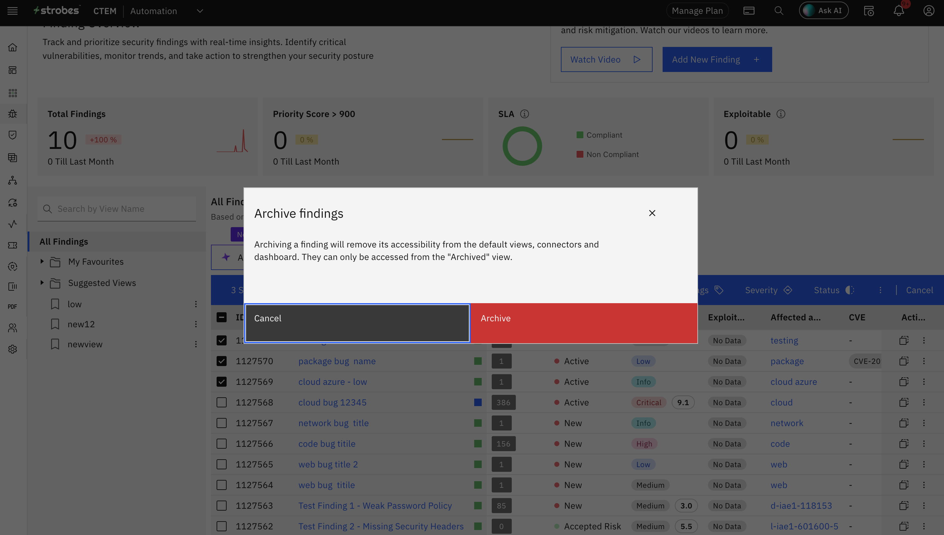- You will be presented with a confirmation pop up. If you wish to go ahead and archive the vulnerabilities, click on 'Archive'.