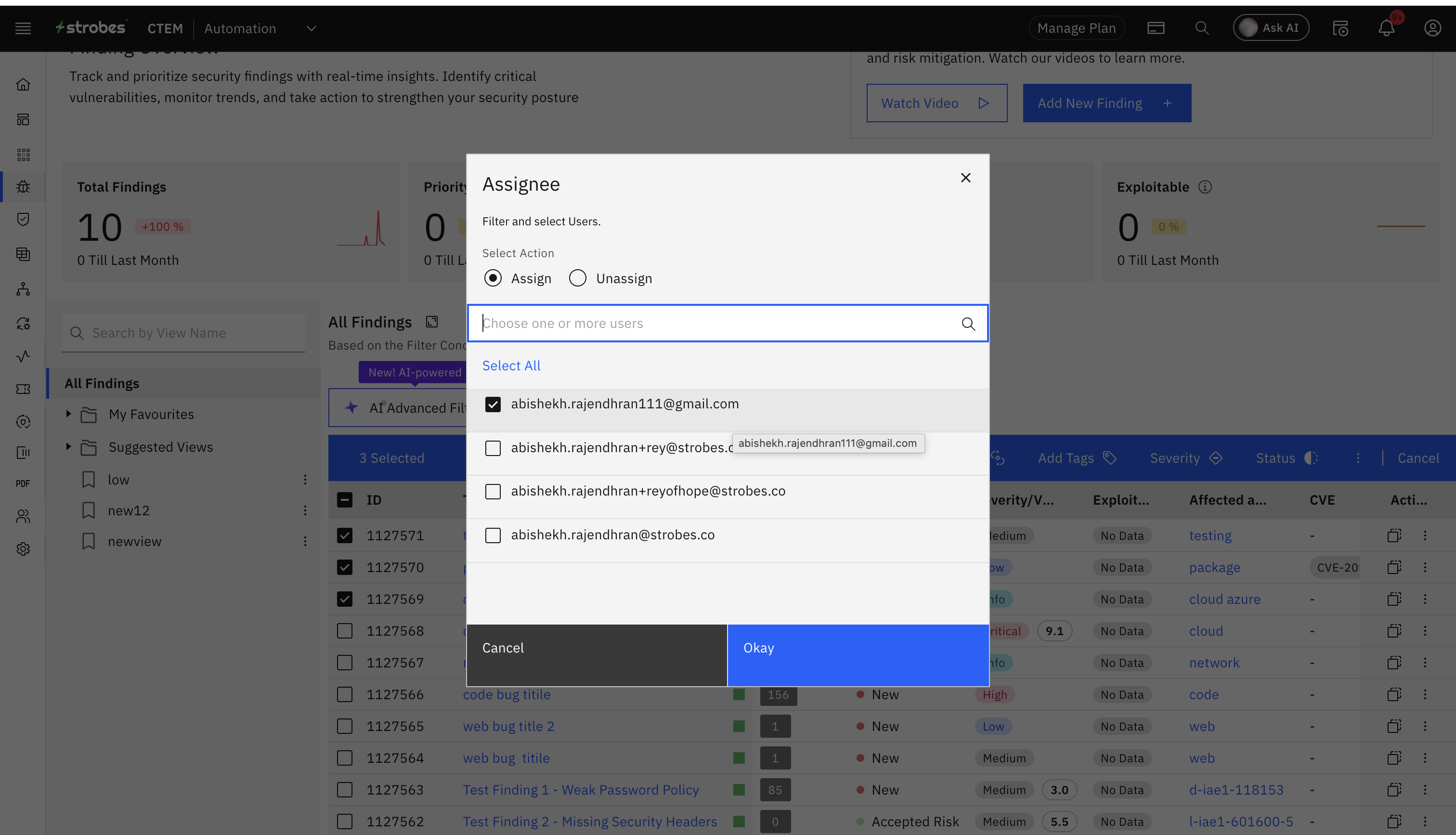 If you need to assign multiple vulnerabilities to one or more users, you can use this option. You can also use this option if you need to unassign multiple vulnerabilities for one or more users.