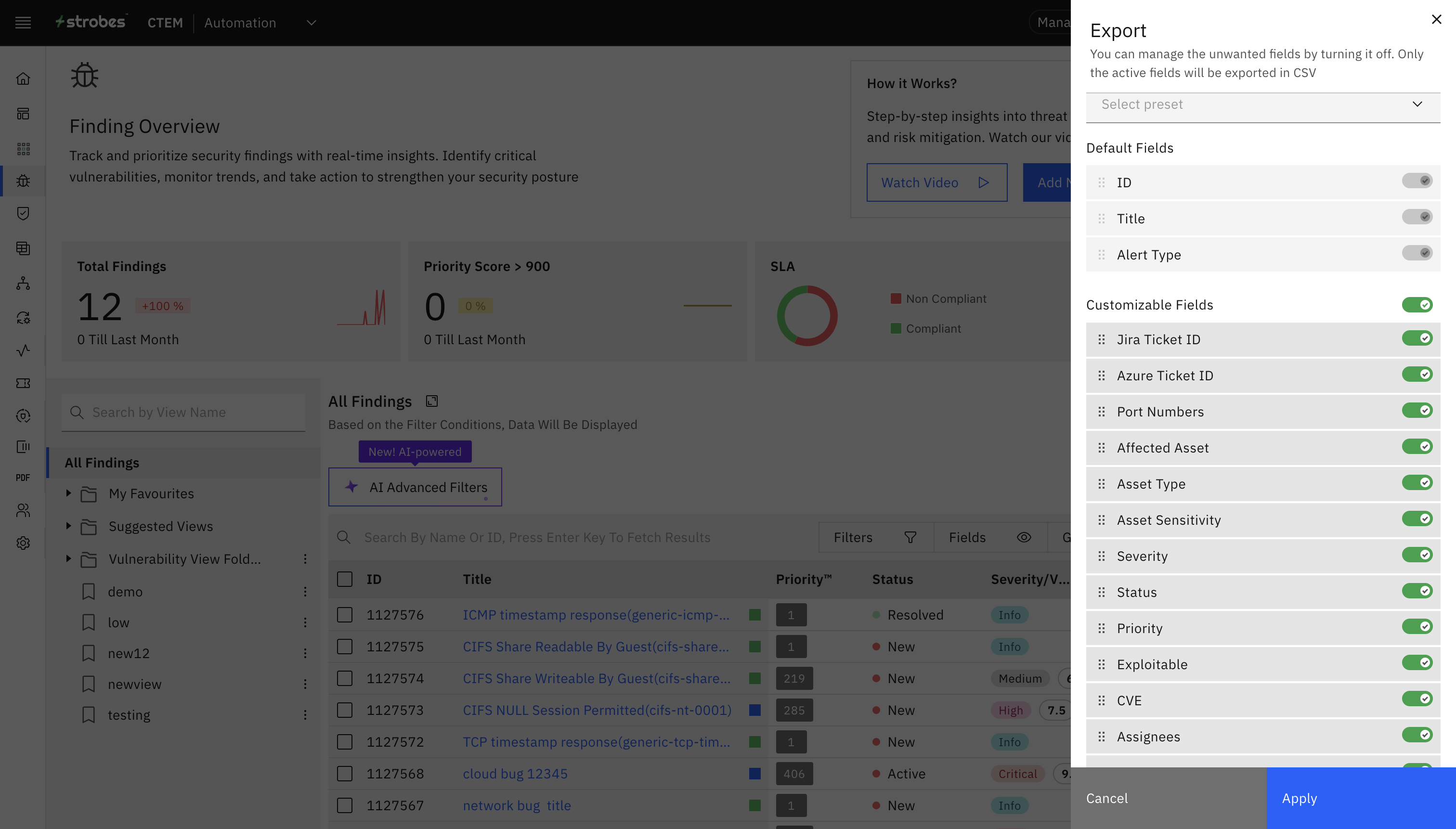 While exporting vulnerabilities as CSV, there are a few fields which will be present by default in the exported file (fixed fields) and there are a few fields which you can select if they have to be present in the exported file or not (customisable fields). By default all the customizable fields will be included in the exported file.