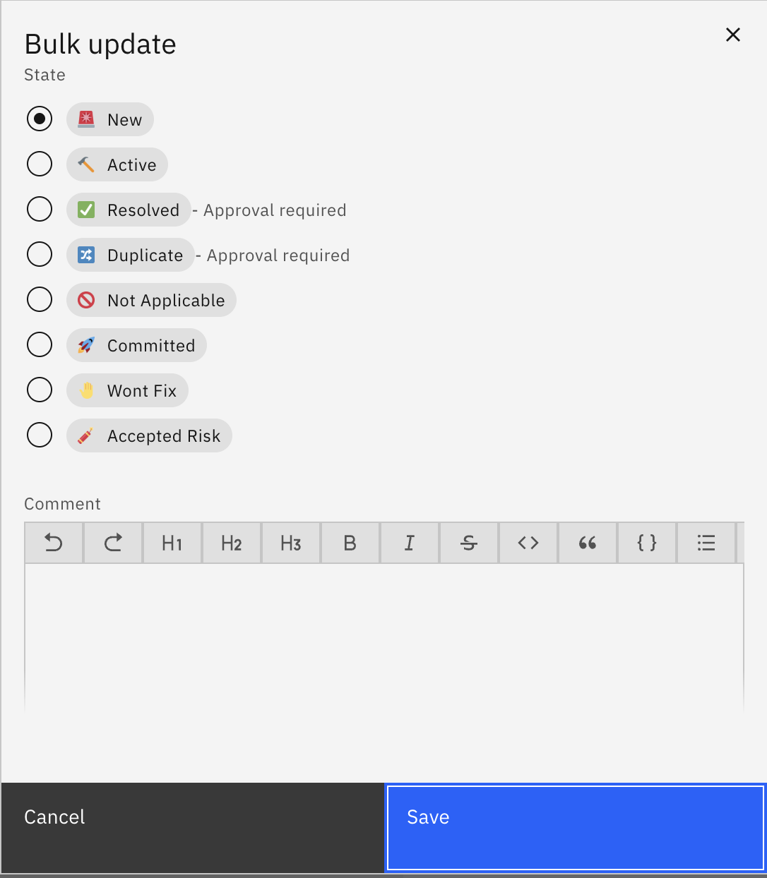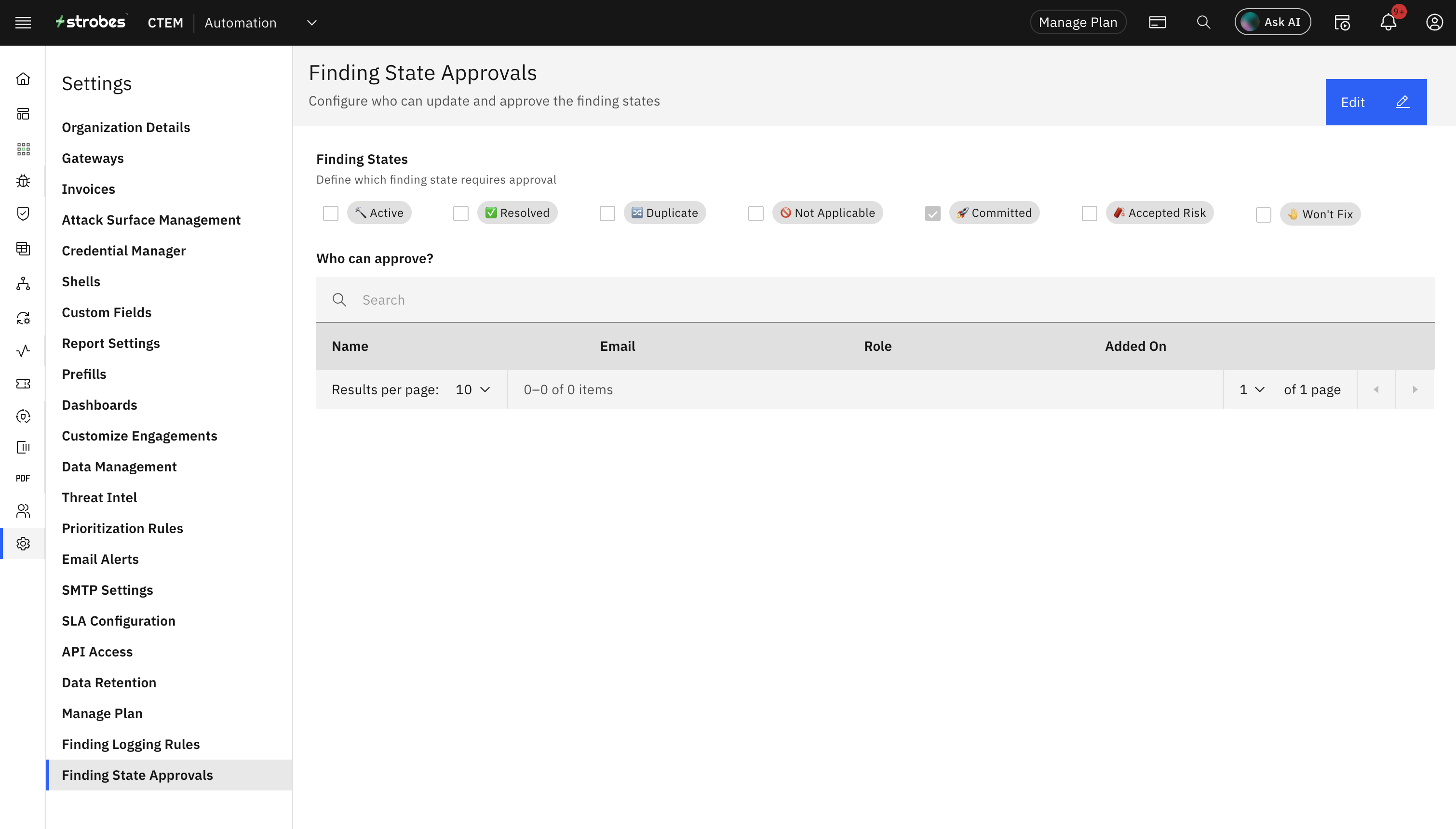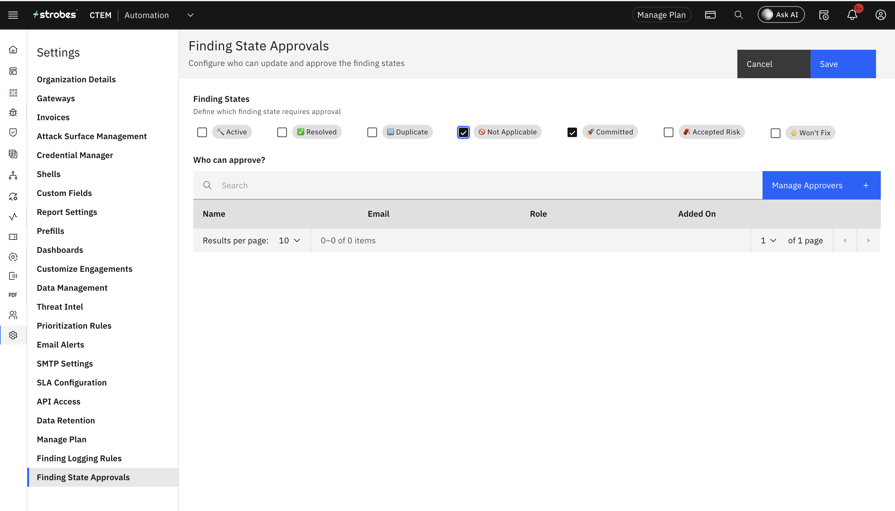 This feature will enable you to create a global setting in your organization for approving the change in the state of a vulnerability. The owner of the organization as well as the manager can create/edit this setting. You can define which vulnerability states will need approval before its state can be changed and you can also add who can approve the change.