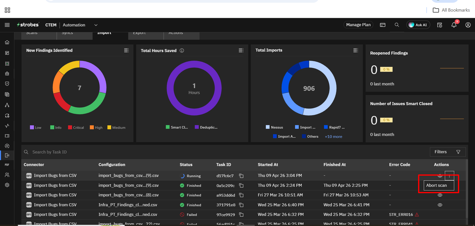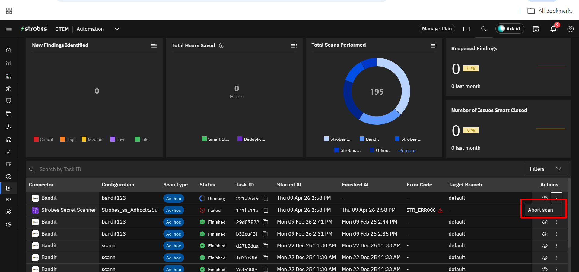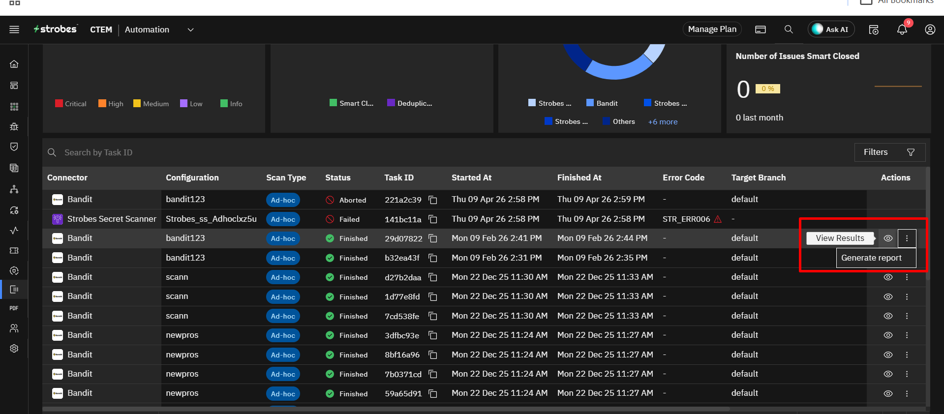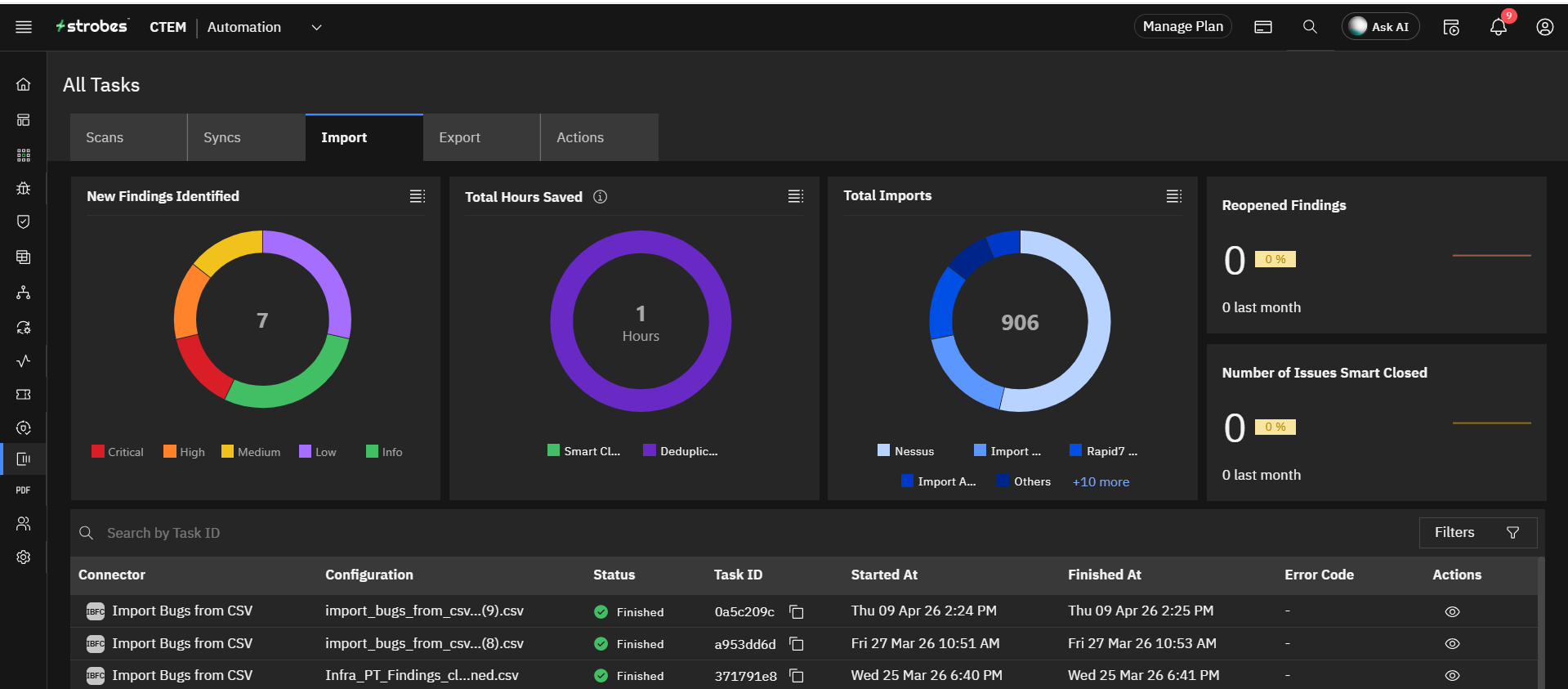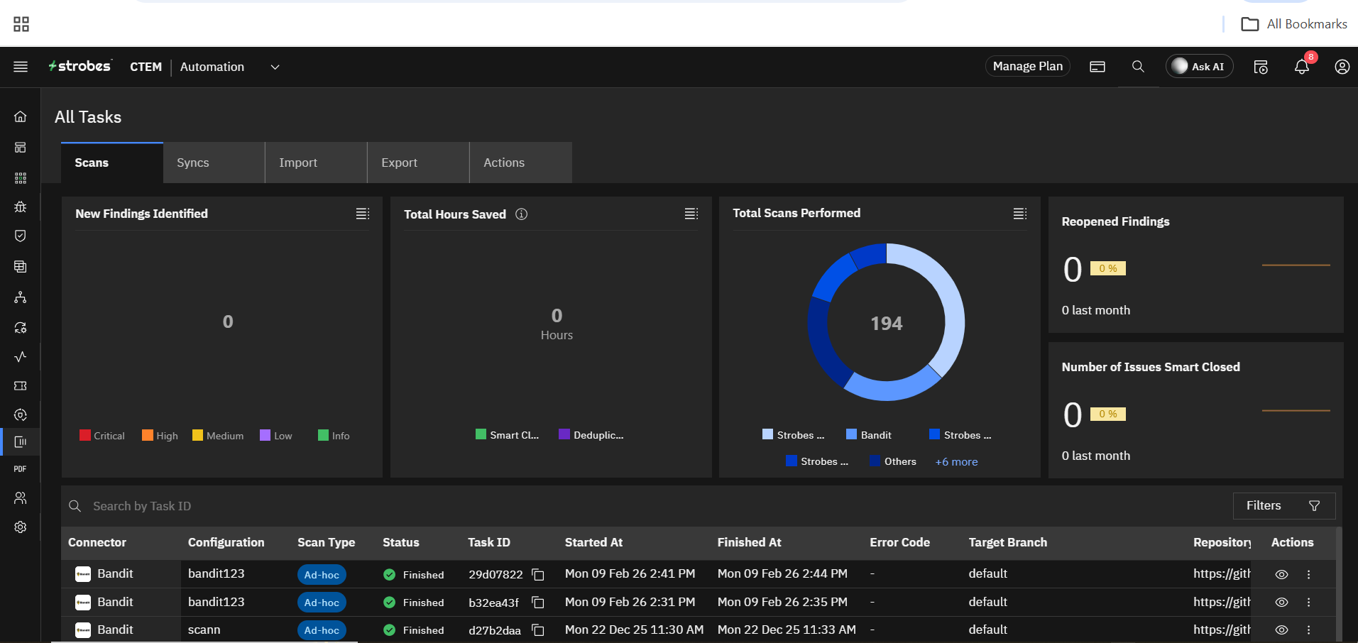 A task is an action that Strobes is performing either on-demand or on schedule. Tasks are generated by several connectors. These are connectors which perform scans, import inventory/vulnerabilities, and export reports/assets.. There are 3 types of tasks:
