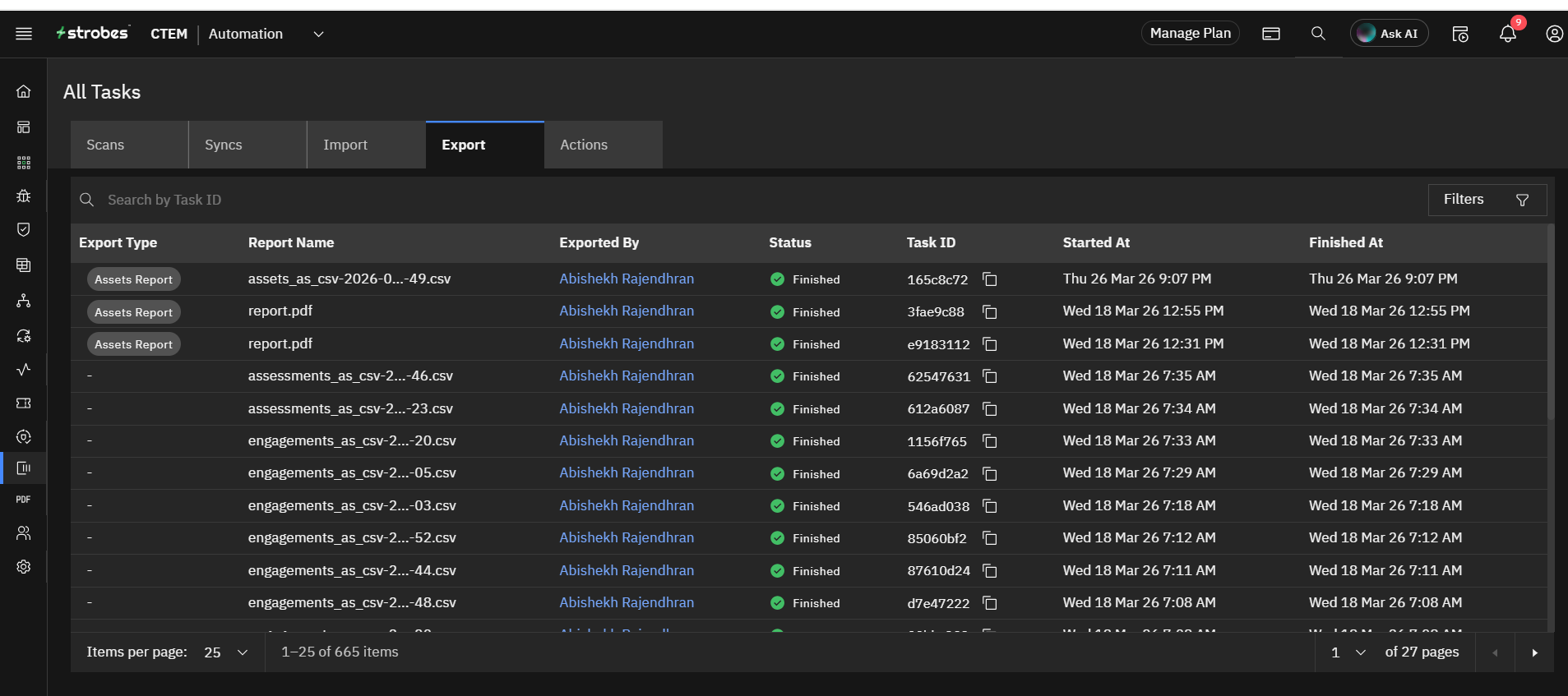 'Export' tasks are created while exporting vulnerabilities or assets.